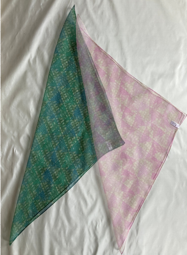 川俣シルク伝統の薄地/軽目羽二重技術を極めた、世界一薄い絹織物「妖精の羽(フェアリーフェザー)」(第4回「日本ものづくり大賞(伝統技術の応用部門)」内閣総理大臣賞受賞)のプリントスカーフ。