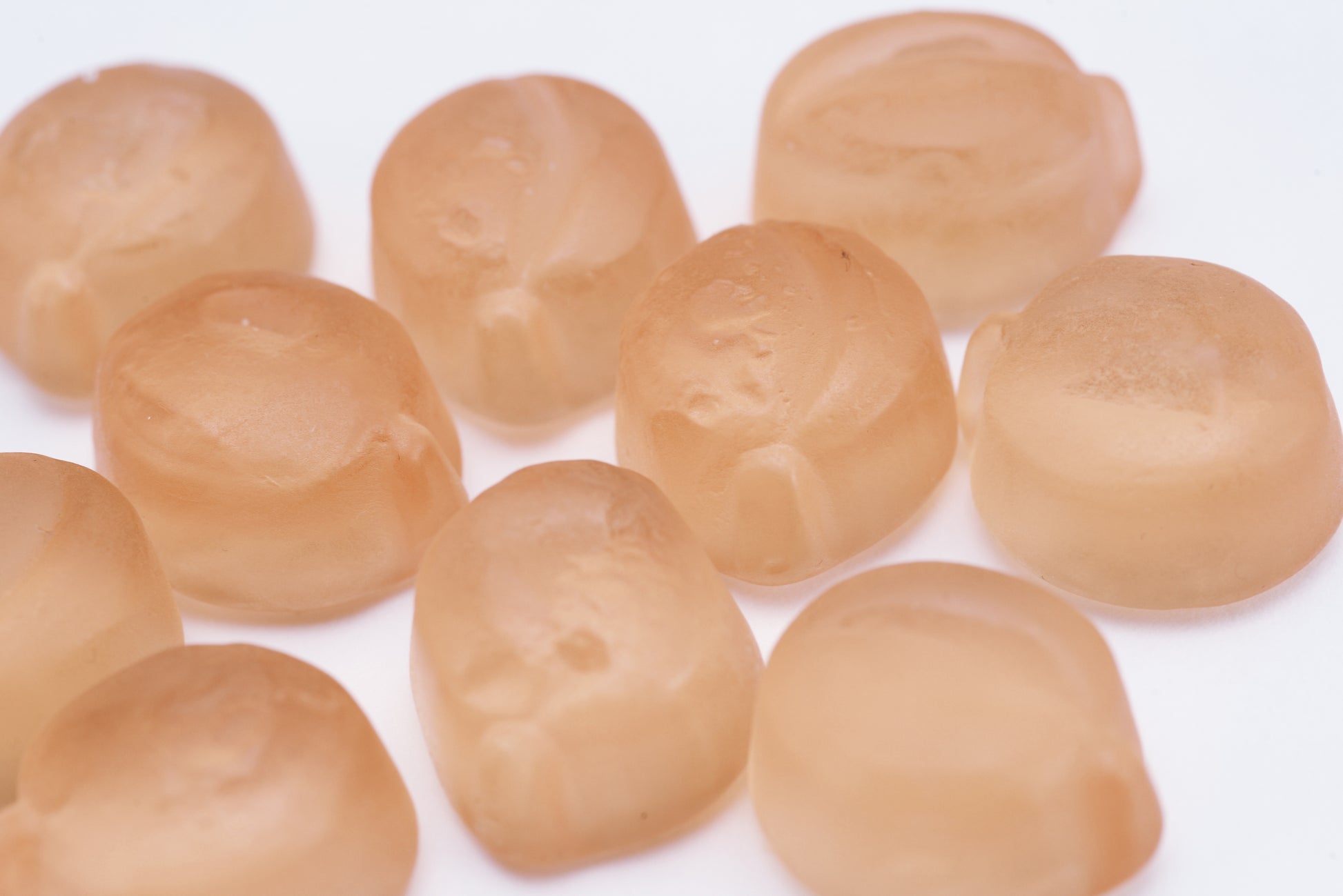 原材料名:水飴(国内製造)、砂糖、果糖ぶどう糖液糖、コラーゲン、もも果汁、濃縮りんご果汁/酸味料、香料、光沢剤、着色料(アントシアニン)、(一部にもも・りんご・ゼラチンを含む)