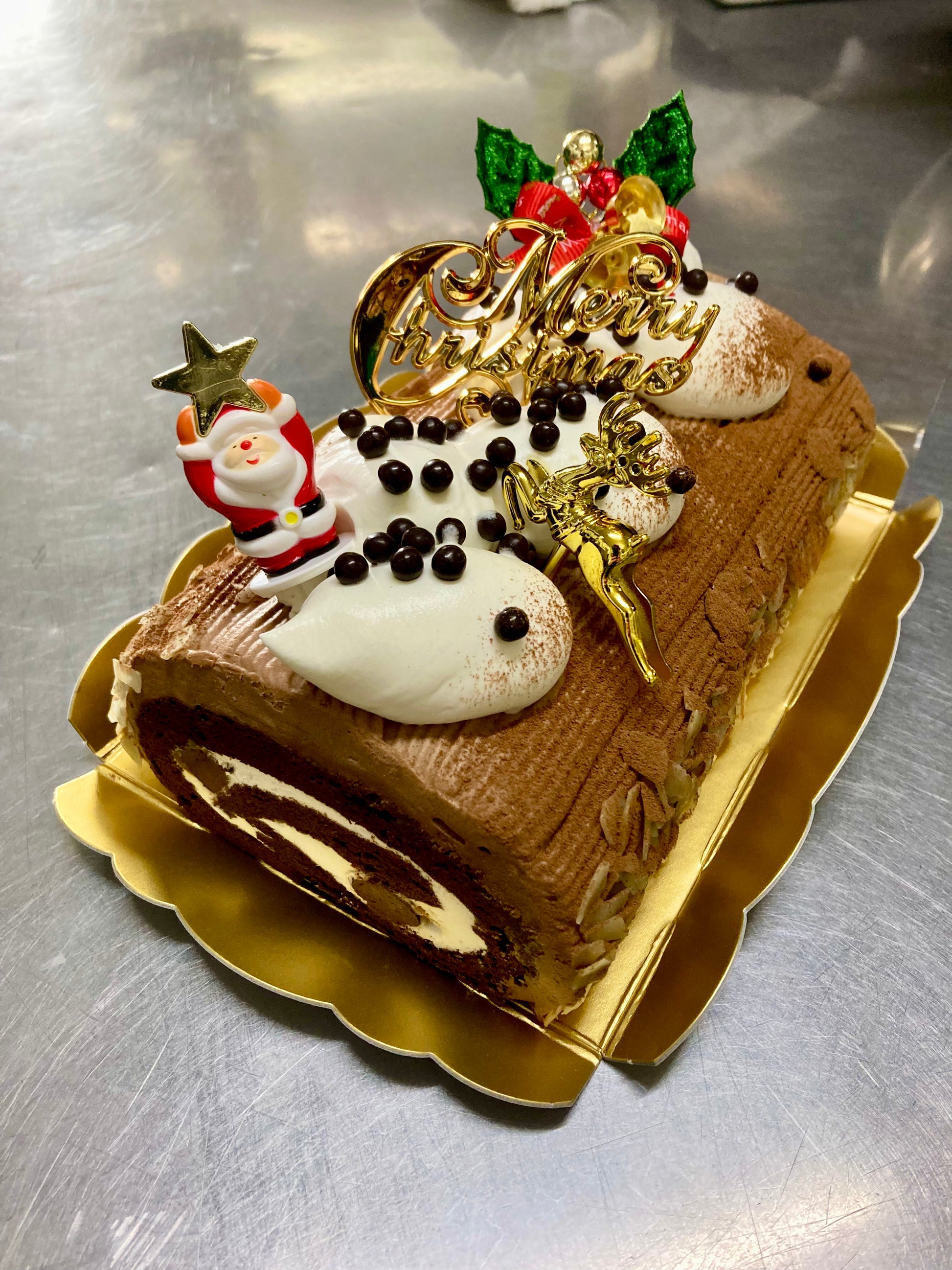 小麦粉・ナッツ不使用のショコラ生地に、クリームたっぷりのロールケーキ。生チョコとキャラメルソース、チョコチップがアクセント。