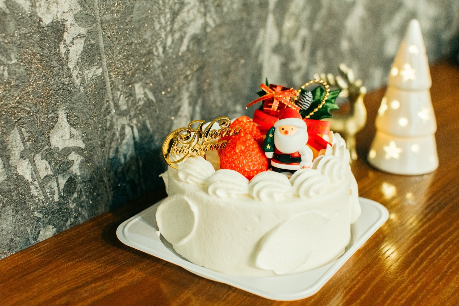 ふわふわしっとりとしたスポンジに生クリームといちごの組み合わせ。サンタさんが乗っています。