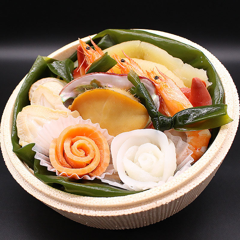 あわび 小、数の子120g、有頭えび3尾、ほたて1個、ほっき貝2枚、つぶ貝2枚、いかお造り、サーモンお造り